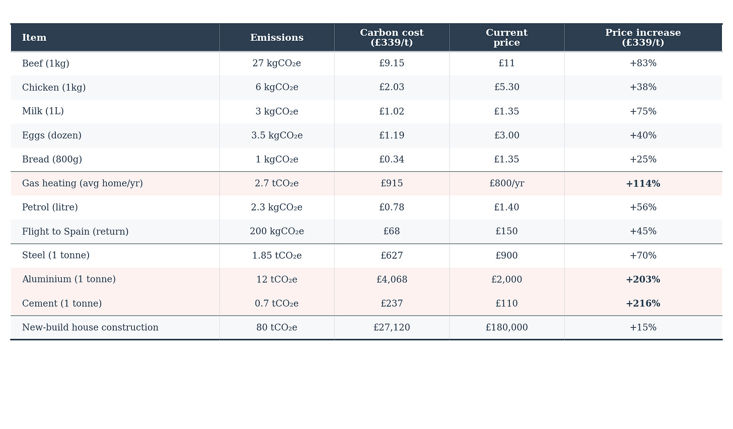 The implicit carbon price in the UK energy system is £339 per tonne. It is unsurprising that energy is so expensive: the table above shows what this price would mean if applied to the rest of the economy. Beef prices would almost double. Heating bills would increase more than twofold. The cost of building a house would rise by 15%. Electricity is the one sector where something approaching this level has actually been implemented - and the result is prices nearly four times the US industrial level and a manufacturing sector in accelerating decline.